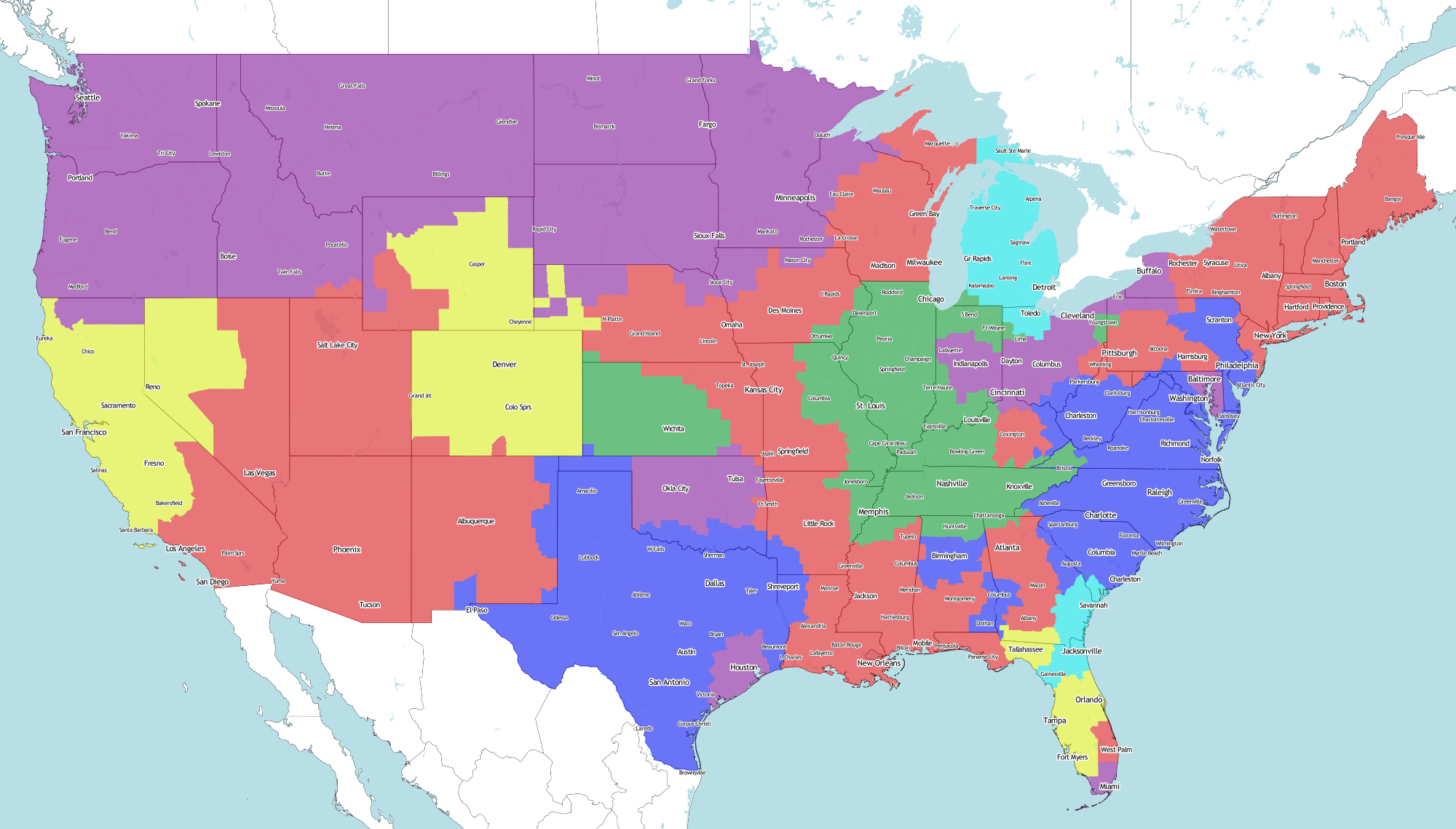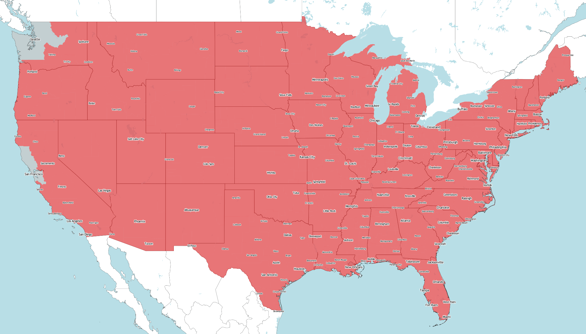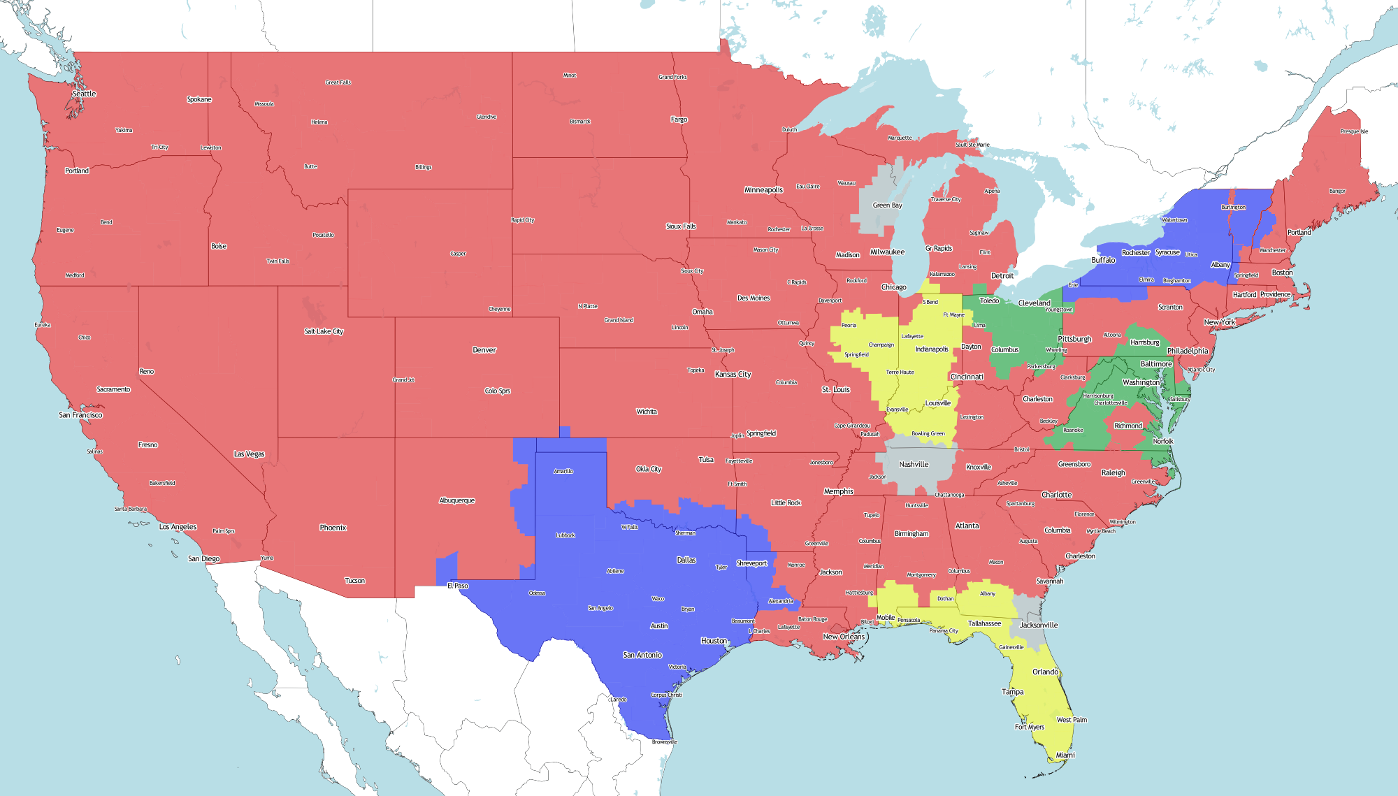 all New England; Atlanta; Pittsburgh; most of LA and MS; West Palm Beach and